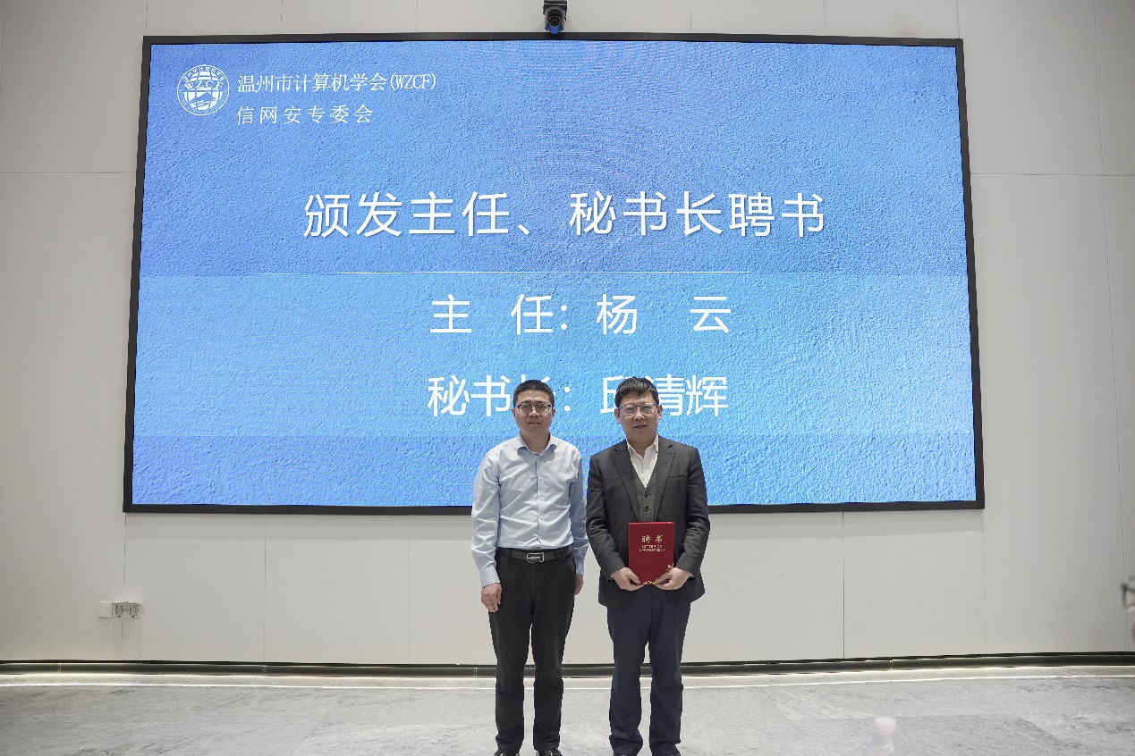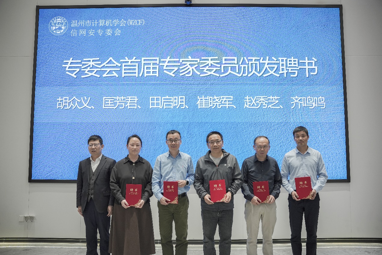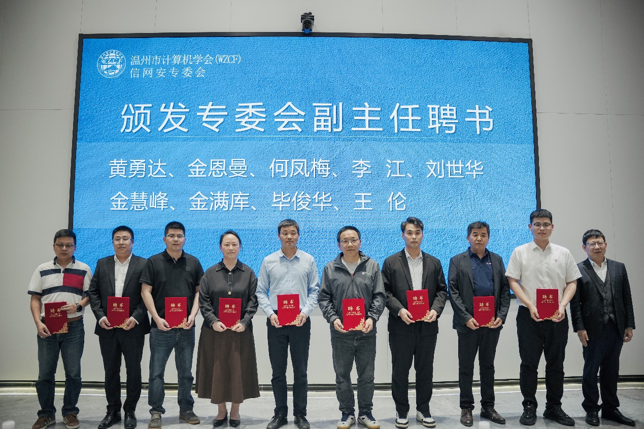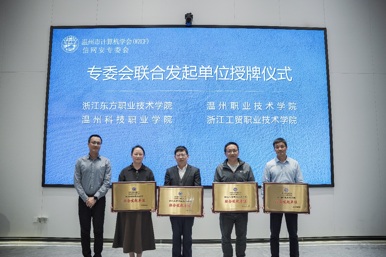 聘浙江东方职业技术学院、温州职业技术学院、温州科技职业学院、浙江工贸职业技术学院为专委会联合发起单位,并由温州市委网信办网络安全和信息化协调处处长曹光升授牌。