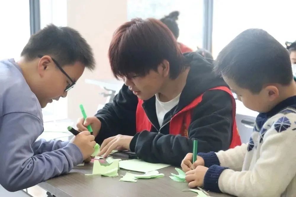 活动伊始,志愿者为小朋友讲解了植树节的由来和意义,认识到植树造林在自然保护中的重要性。孩子们在课堂上积极发言,讲述自己对于植树节的印象。志愿者为小朋友们准备了纸、笔等材料,让孩子们自己动手画出树的形状,剪出树干并用双面胶将树叶与树干进行组合,志愿者在一旁指导。制作完成后,孩子们按耐不住自己激动的心,拿着做出来的小树迫不及待地与父母分享。